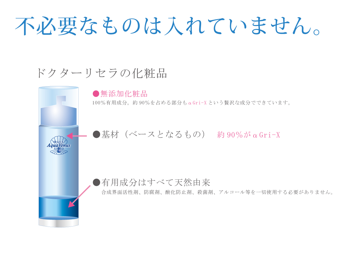 ドクターリセラの製品は、洗浄かつミネラル豊富な海洋深層水「αGri-X」が主成分。つまり、ベースとなる水そのものがお肌に働きかける高い機能を持っているのです。